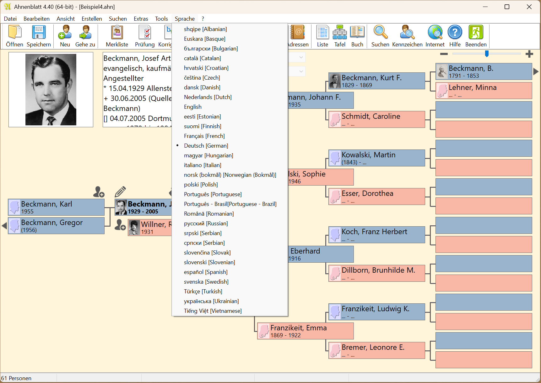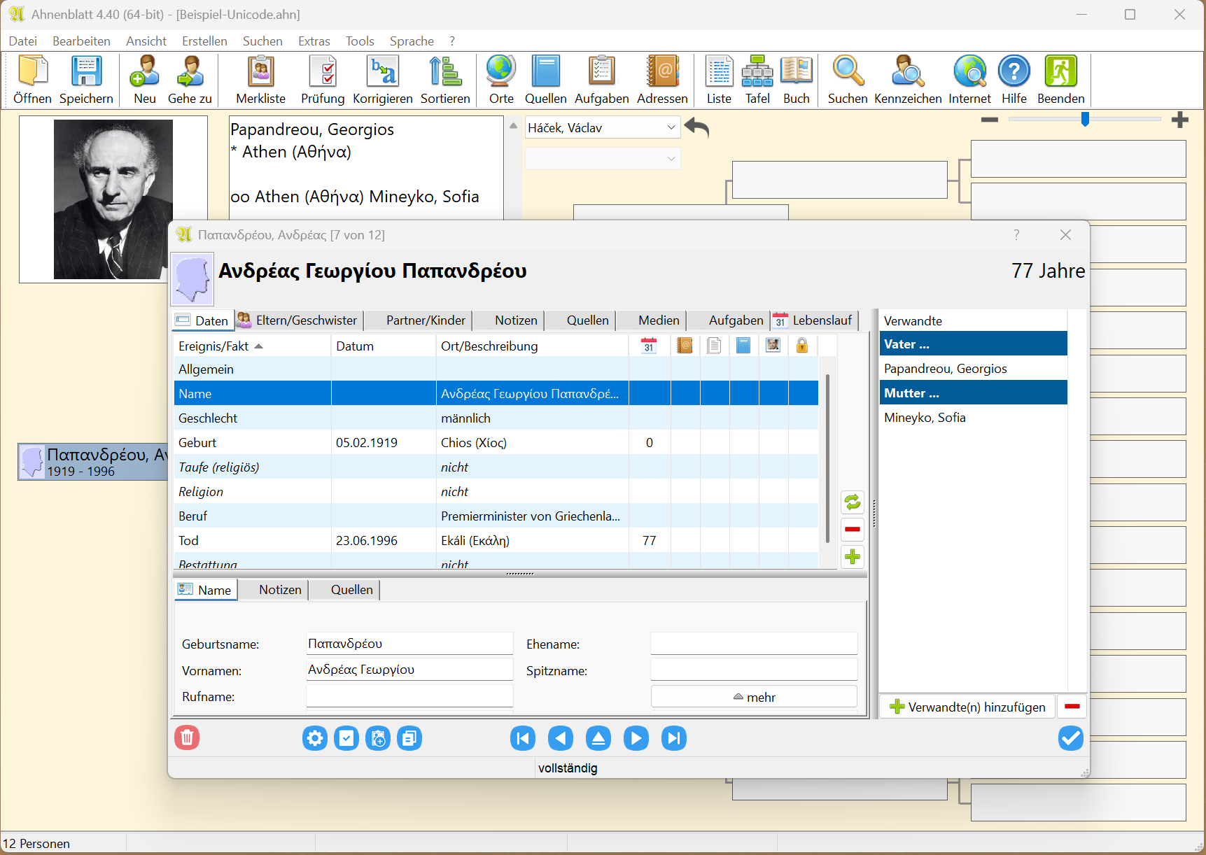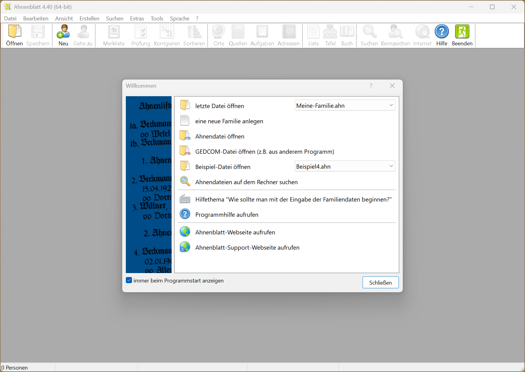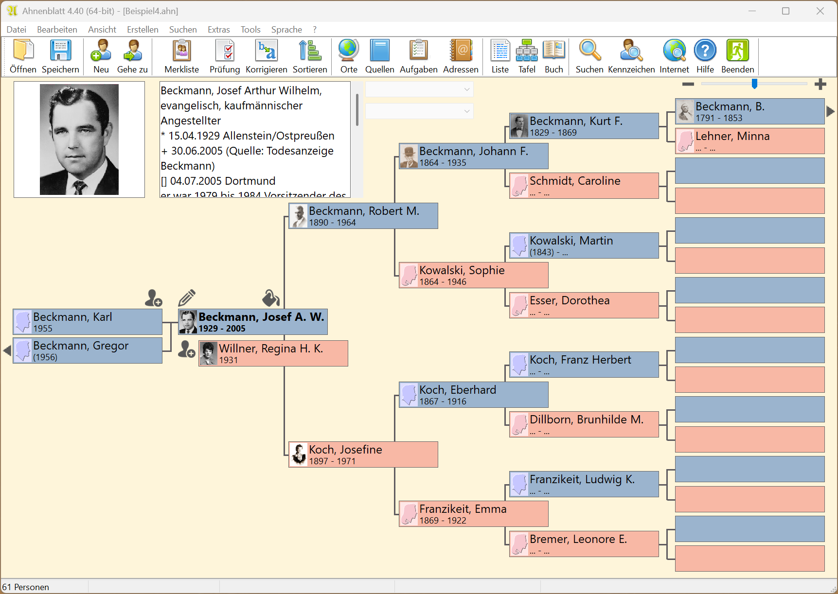 Hier die Programmoberfläche von Ahnenblatt in Bildern (durch Anklicken werden vergrößerte Bilder angezeigt):