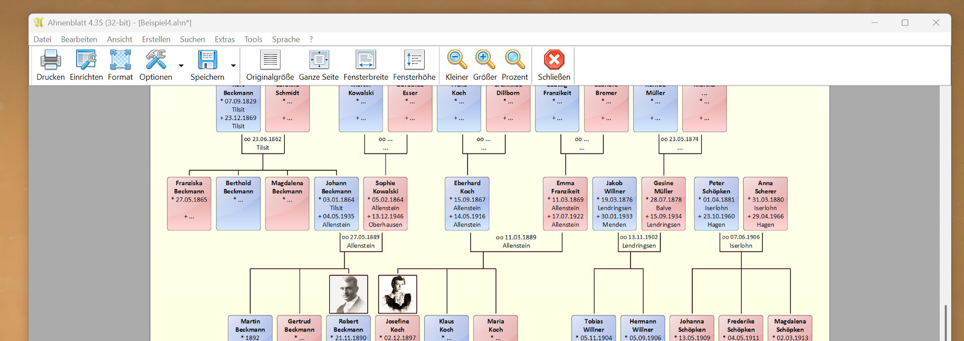 In Tafeln gibt es die Möglichkeit auch Profilbilder darzustellen. Nun hat man allerdings nicht für jede Person auch Bilder. Gerade in den älteren Generationen gibt es keine Bilder und vielleicht fehlen auch in den jüngsten Generationen welche. Ahnenblatt bietet daher die Option Standardbilder für männliche und weibliche Personen als Alternative anzuzeigen. Aber egal wie man es macht: entweder fehlen viele Bilder oder man hat viele gleiche Standardbilder in der Tafel – auf jeden Fall wird dadurch in Generationen ohne eigene Profilbilder Platz in der Höhe verschwendet.