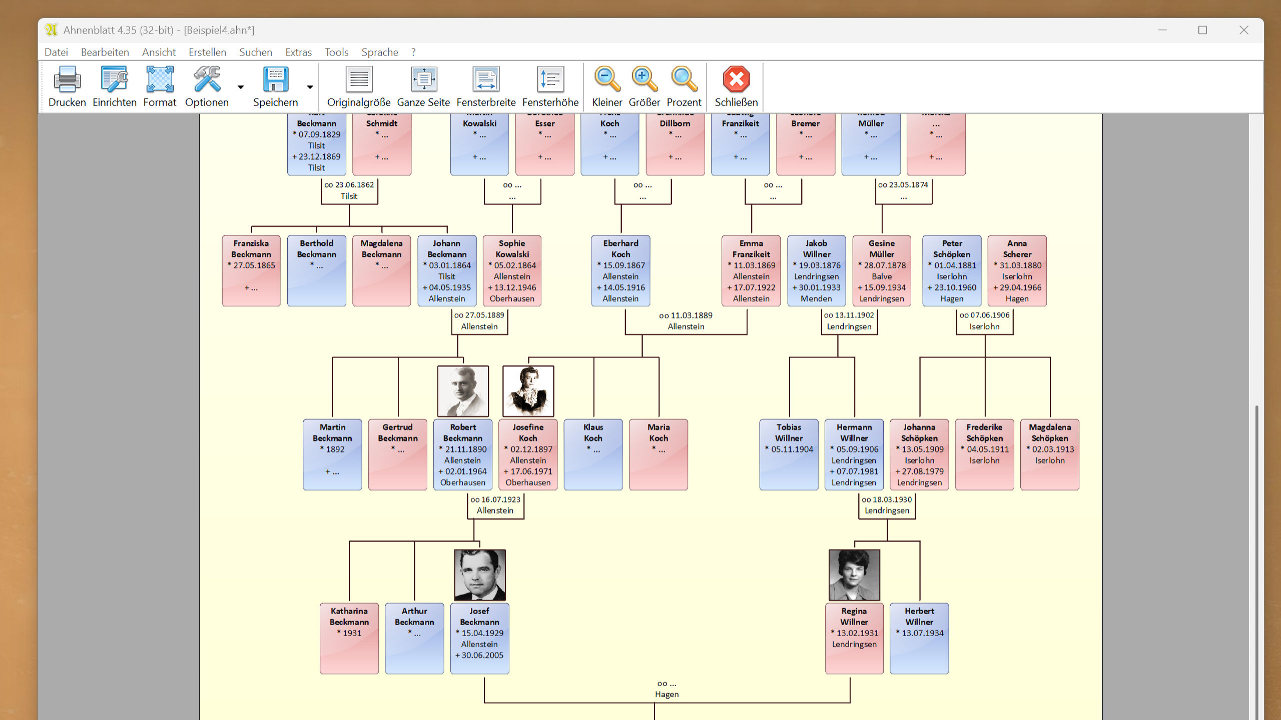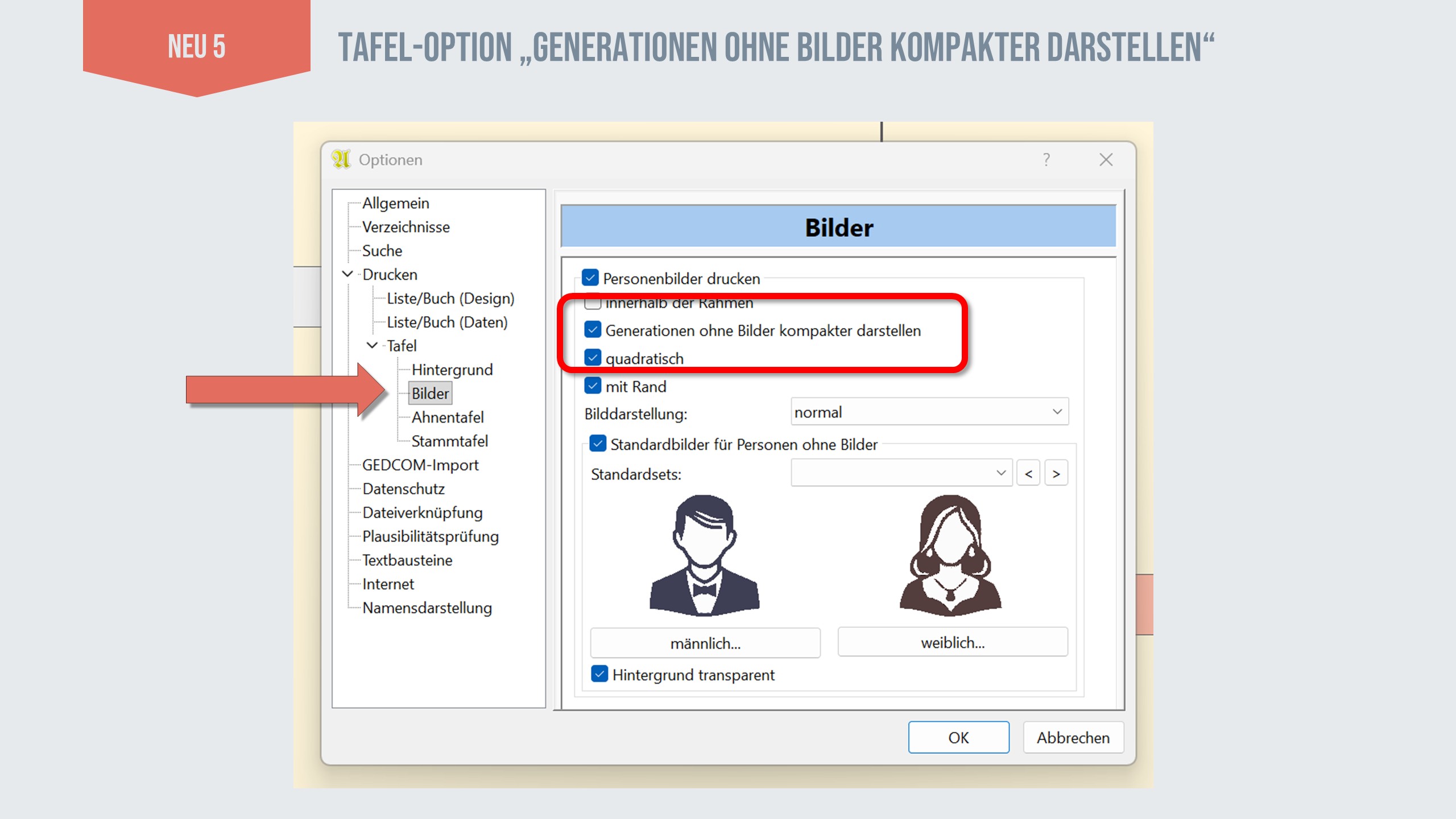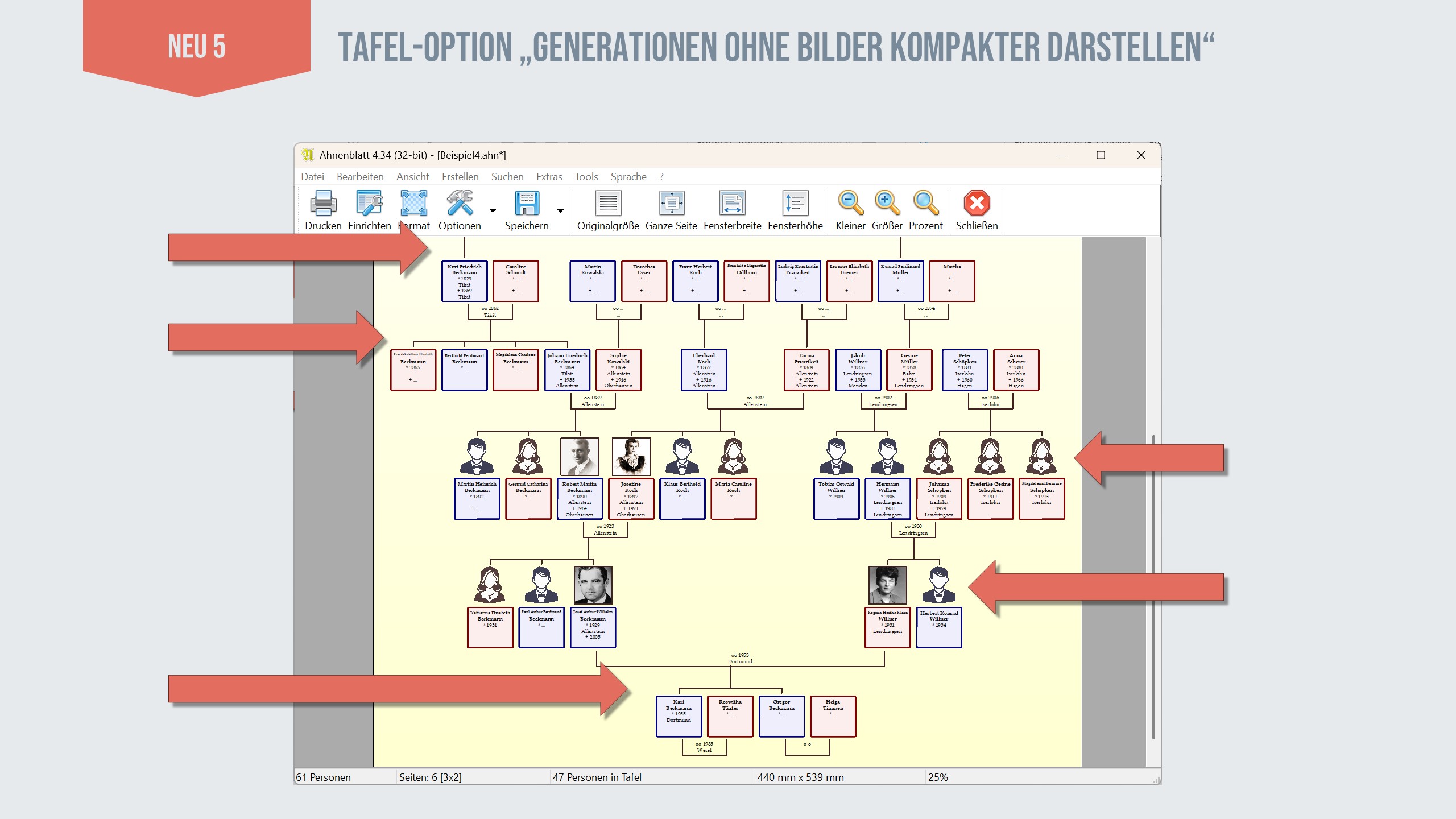 In Tafeln gibt es die Möglichkeit auch Profilbilder darzustellen. Nun hat man allerdings nicht für jede Person auch Bilder. Gerade in den älteren Generationen gibt es keine Bilder und vielleicht fehlen auch in den jüngsten Generationen welche. Ahnenblatt bietet daher die Option Standardbilder für männliche und weibliche Personen als Alternative anzuzeigen. Aber egal wie man es macht: entweder fehlen viele Bilder oder man hat viele gleiche Standardbilder in der Tafel – auf jeden Fall wird dadurch in Generationen ohne eigene Profilbilder Platz in der Höhe verschwendet.