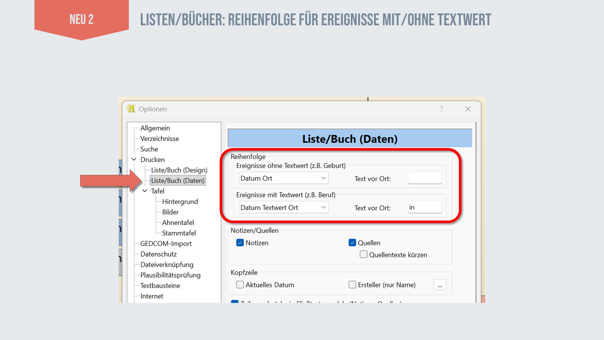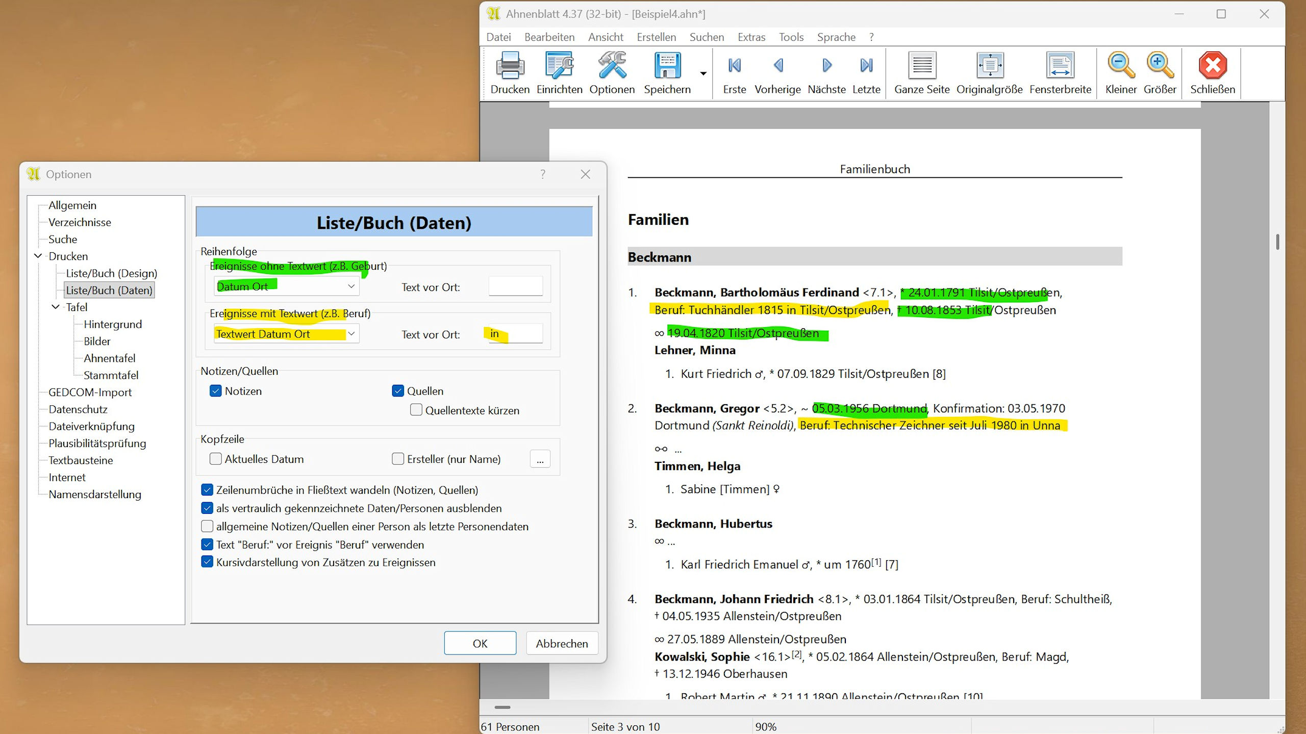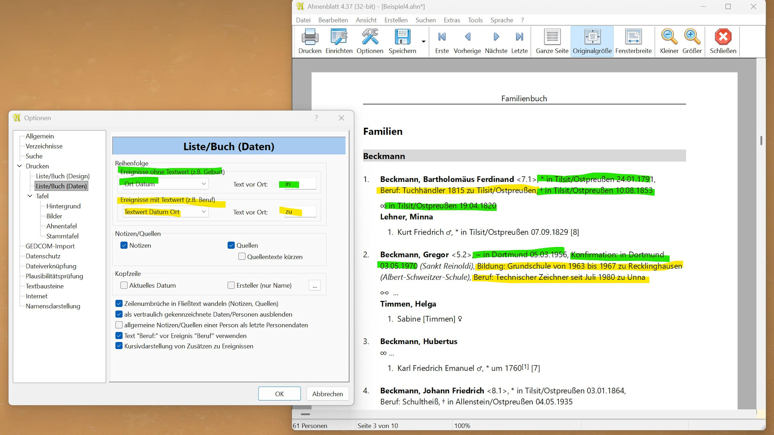 Wie das in der Praxis im Familienbuch aussehen kann, habe ich in Beispielen als Bilder unten angefügt. Entsprechend gelten diese neuen Optionen auch für Listen.